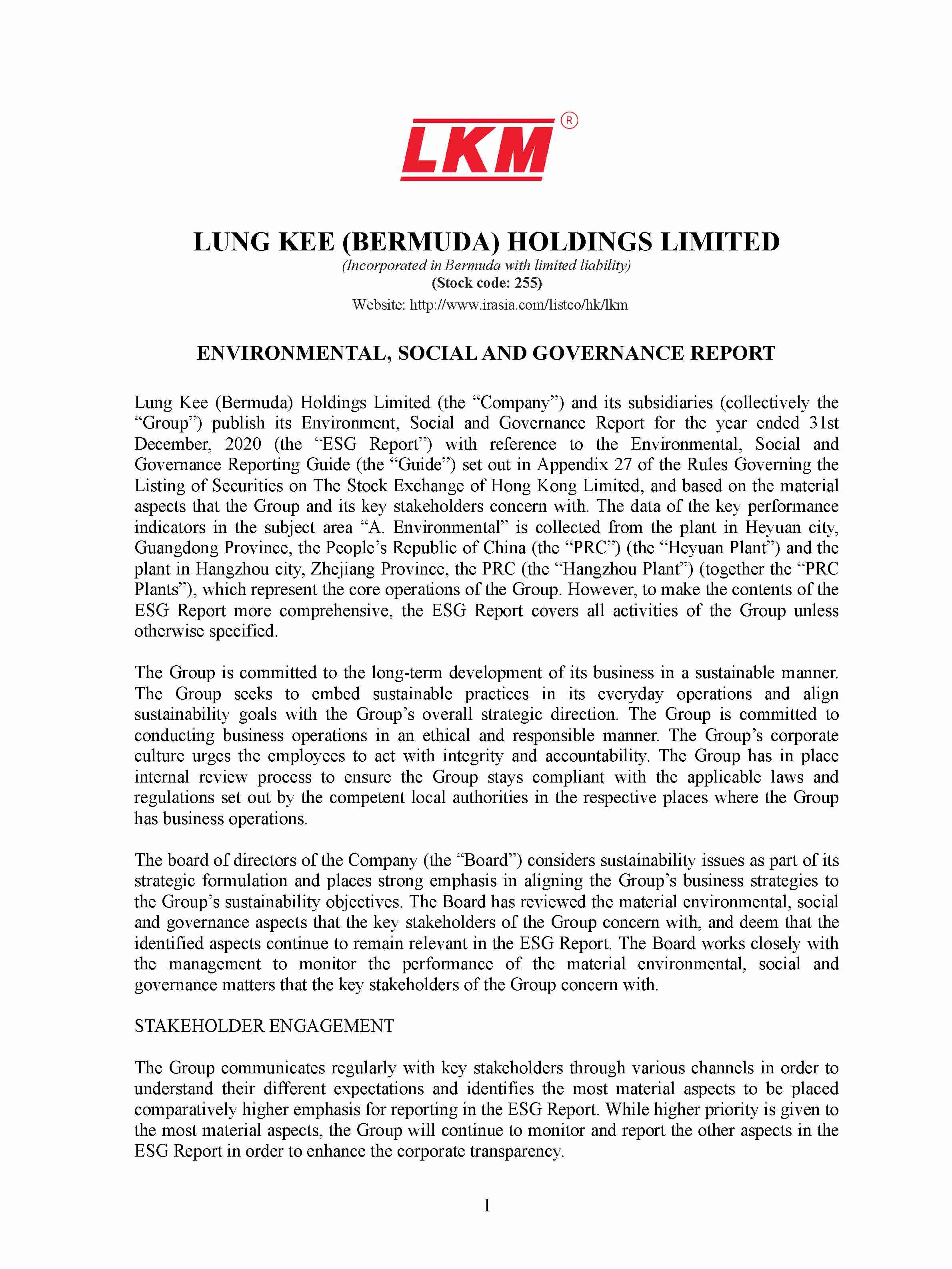 ENVIRONMENTAL, SOCIAL AND GOVERNANCE REPORT