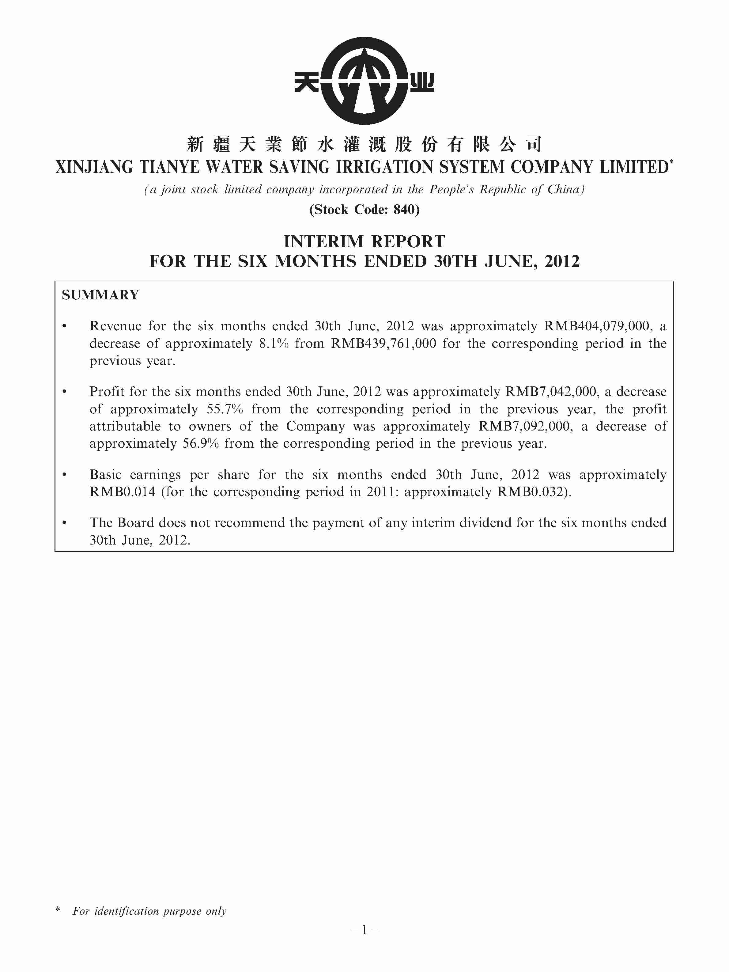 • INTERIM REPORT FOR THE SIX MONTHS ENDED 30TH JUNE, 2012 00840 - TIANYE WATER