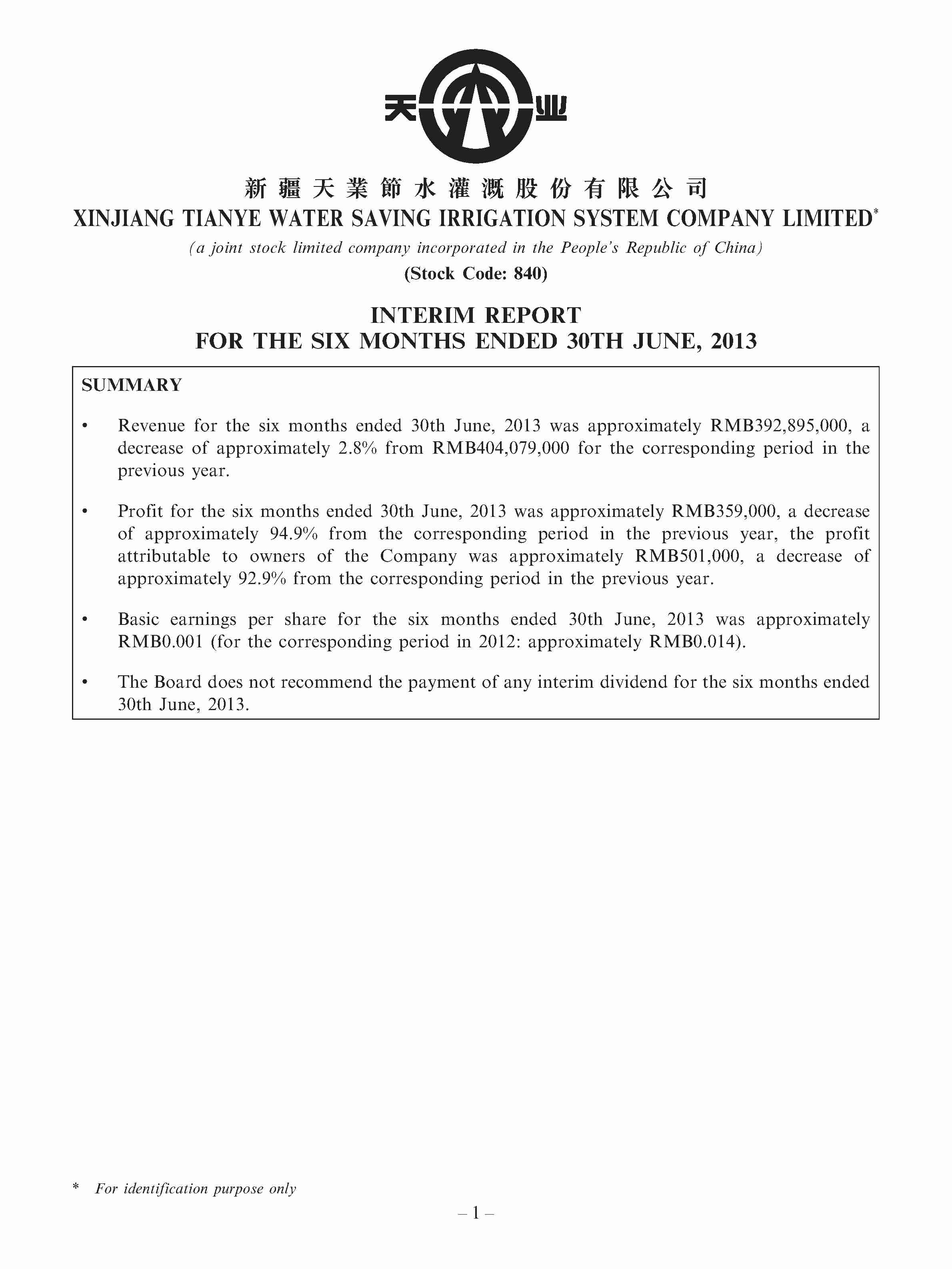• INTERIM REPORT FOR THE SIX MONTHS ENDED 30TH JUNE, 2013 00840 - TIANYE WATER