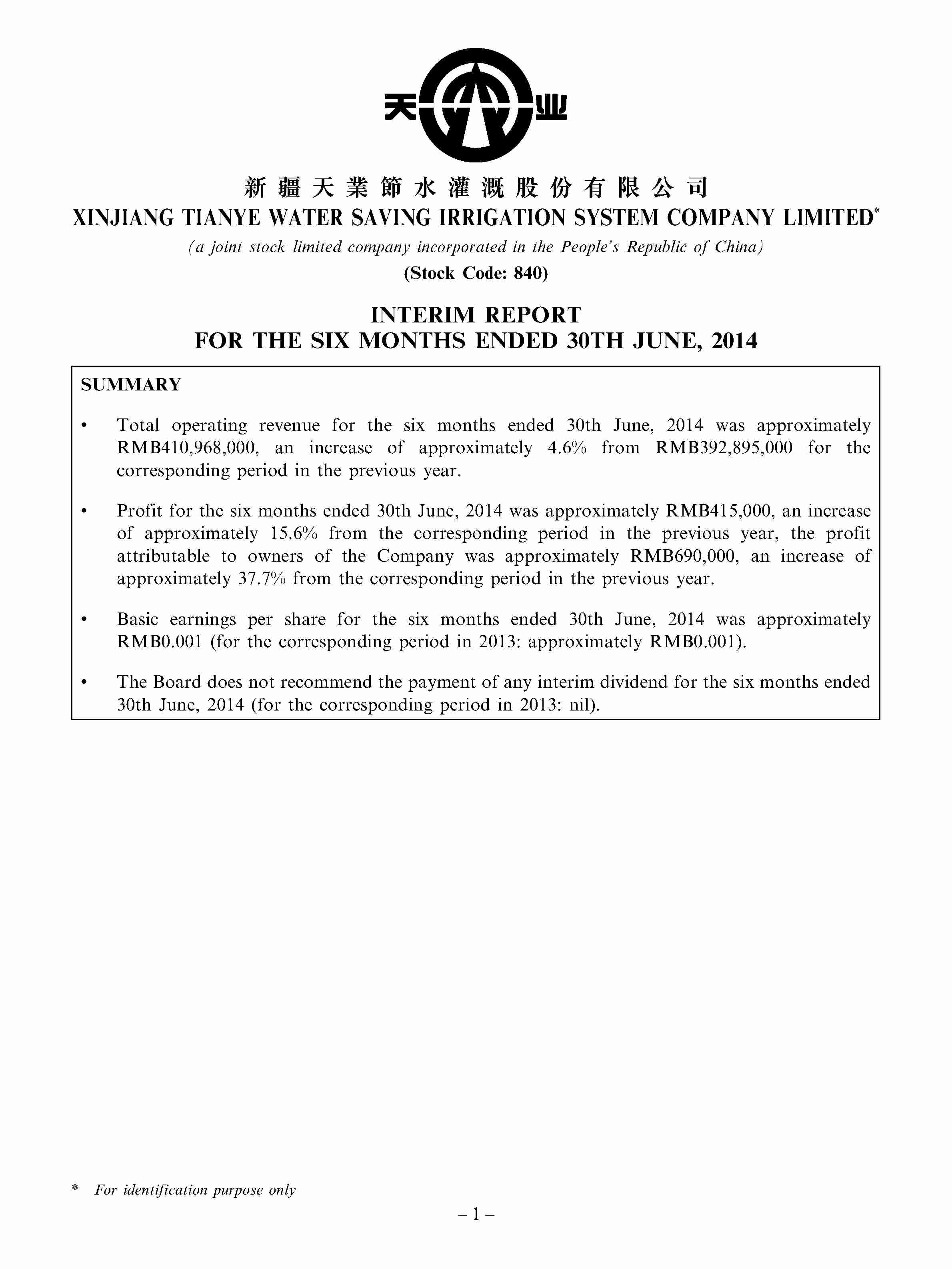 • INTERIM REPORT FOR THE SIX MONTHS ENDED 30TH JUNE, 2014 00840 - TIANYE WATER