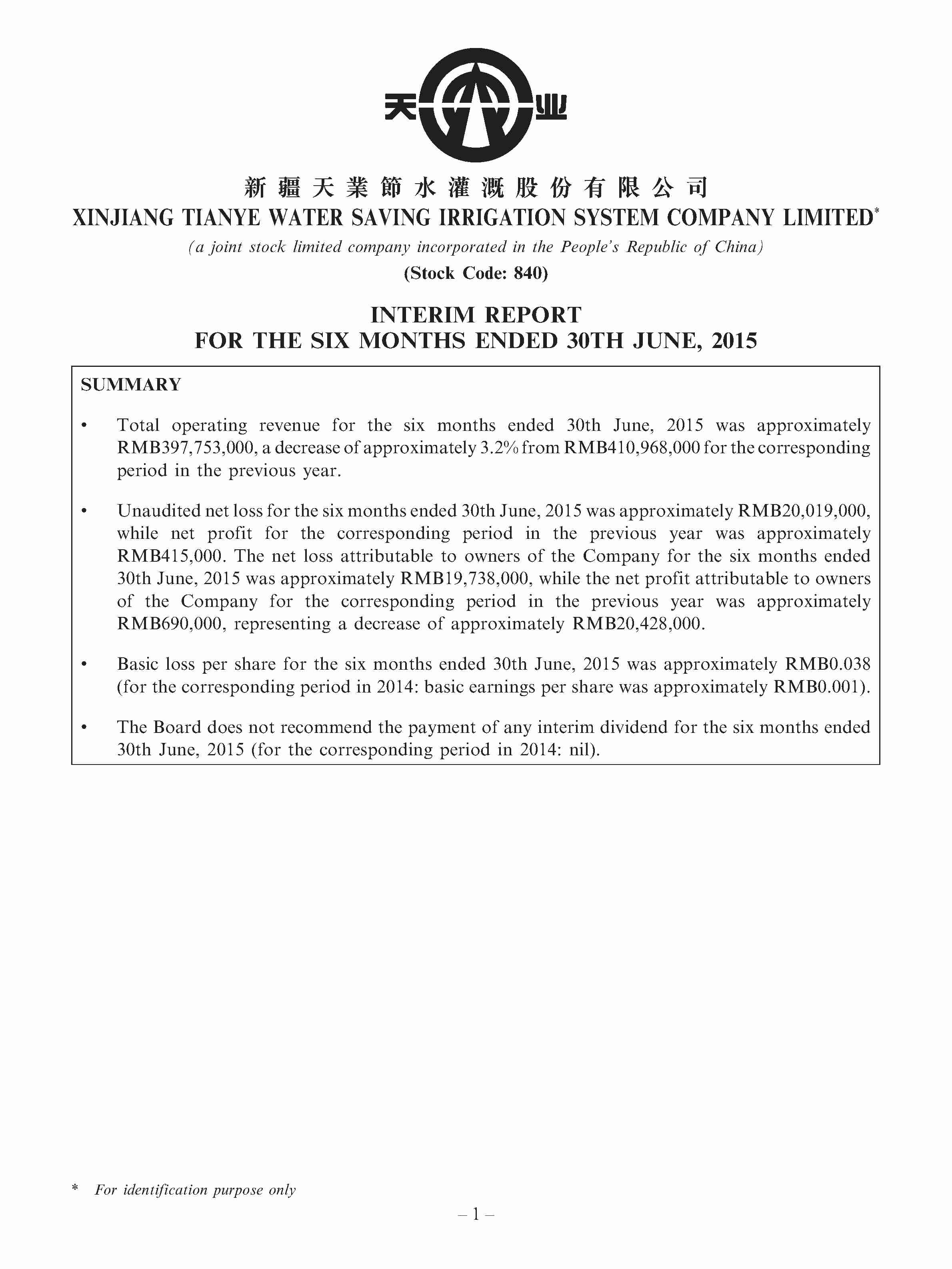 • INTERIM REPORT FOR THE SIX MONTHS ENDED 30TH JUNE, 2015 00840 - TIANYE WATER