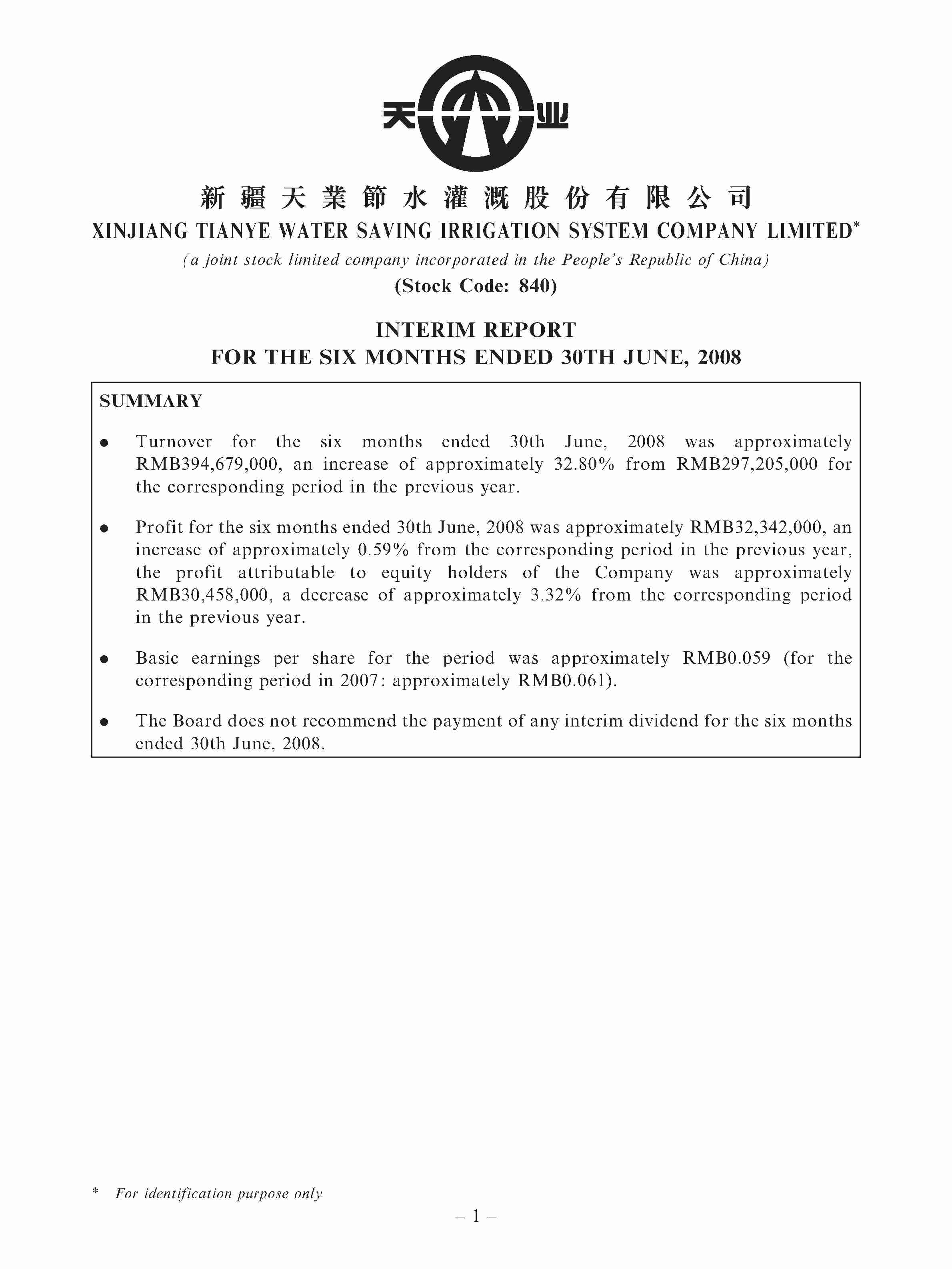 • INTERIM REPORT FOR THE SIX MONTHS ENDED 30TH JUNE, 2008 00840 - TIANYE WATER