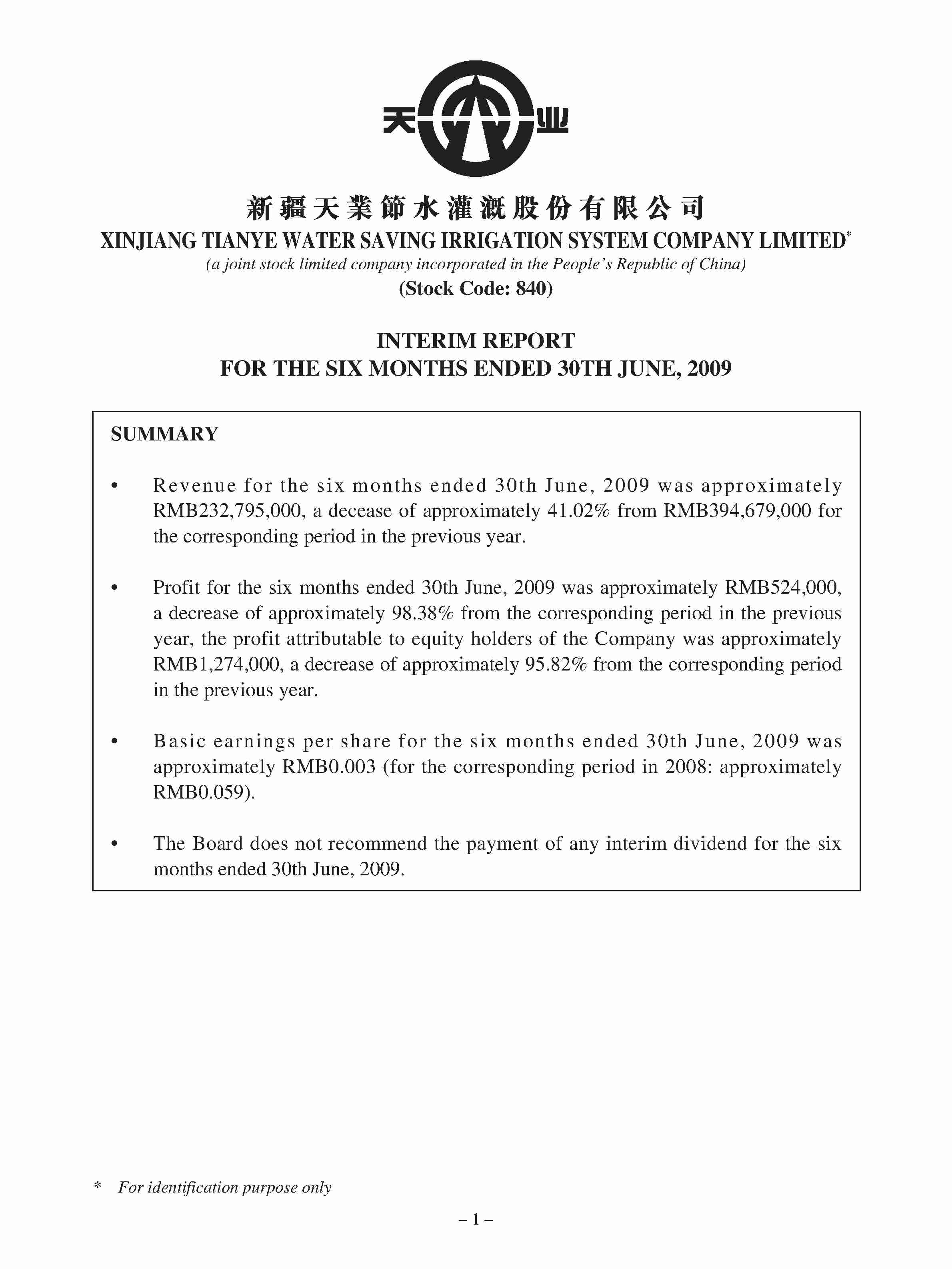 • INTERIM REPORT FOR THE SIX MONTHS ENDED 30TH JUNE, 2009 00840 - TIANYE WATER