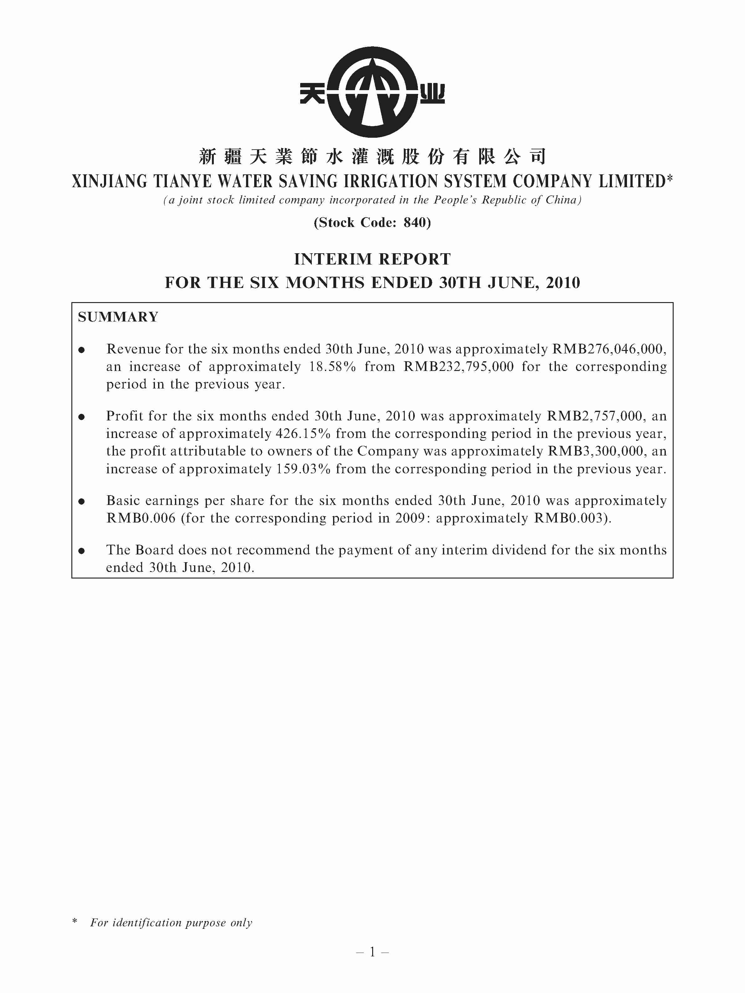 • INTERIM REPORT FOR THE SIX MONTHS ENDED 30TH JUNE, 2010 00840 - TIANYE WATER