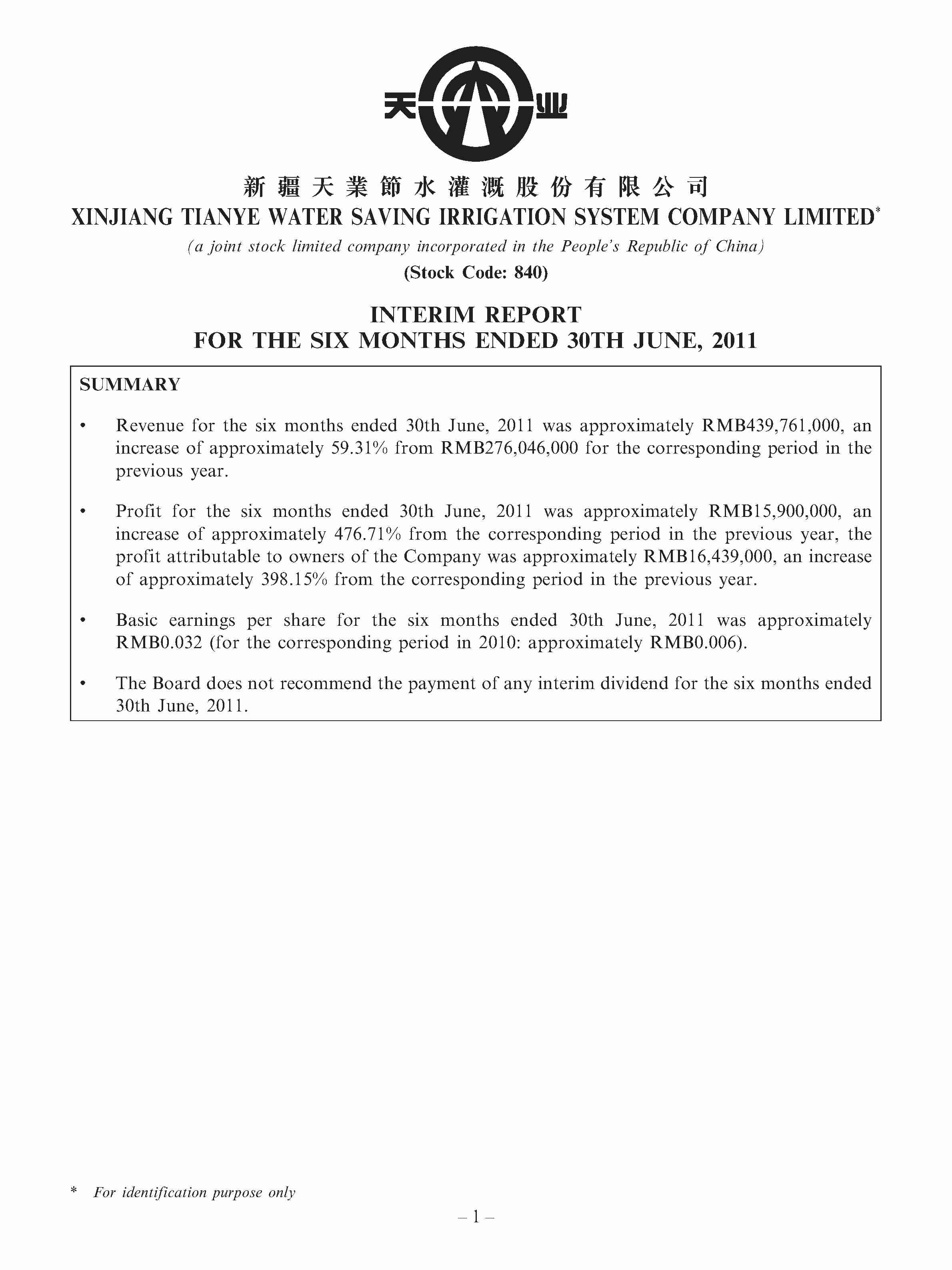 • INTERIM REPORT FOR THE SIX MONTHS ENDED 30TH JUNE, 2011 00840 - TIANYE WATER