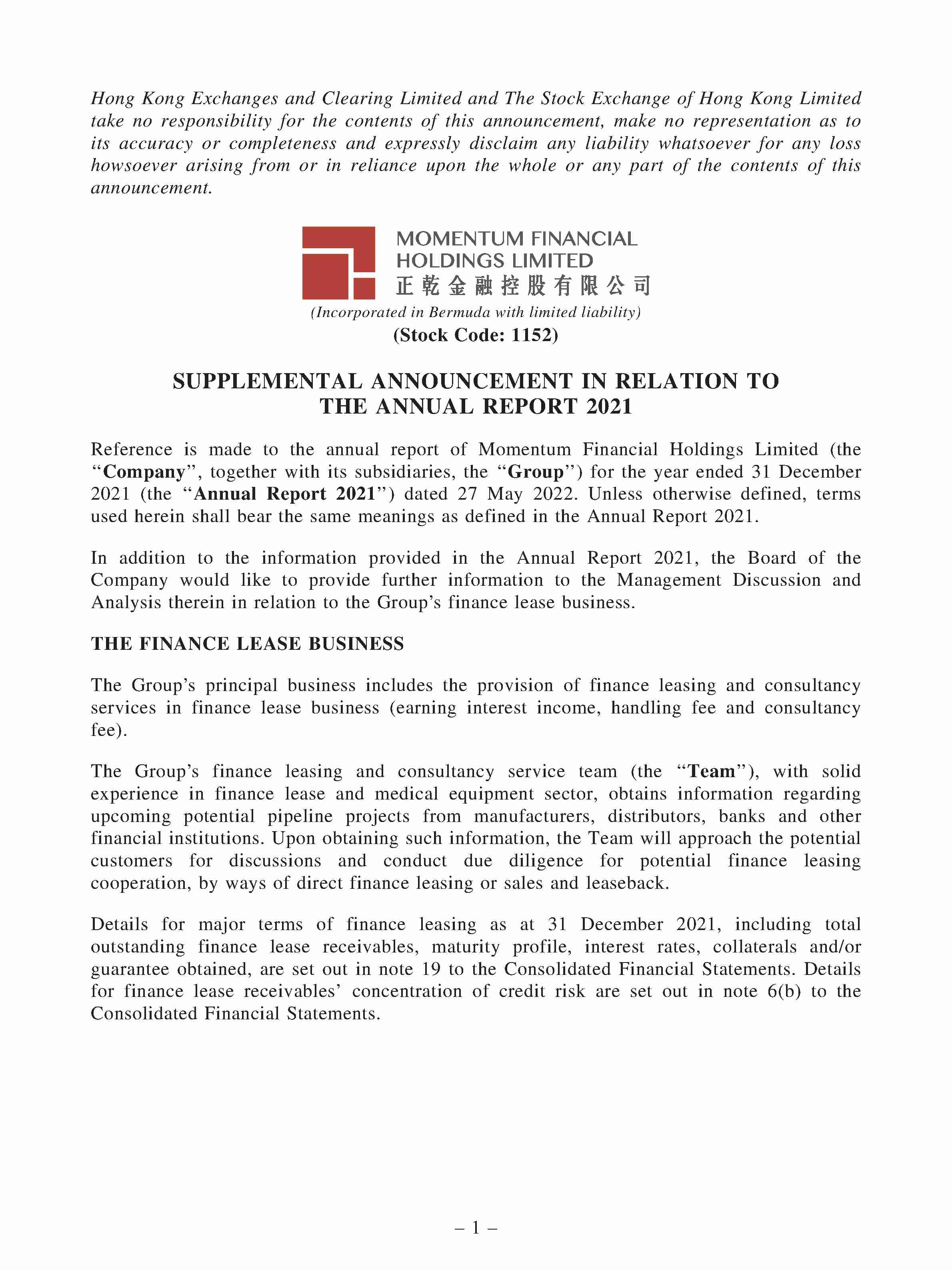Momentun Financial Holdings Limited (“Momentum Financial Holdings” or “the Group”) was established in 1995 and was listed on the Main Board of the Hong Kong Stock Exchange on 28 October 2011 under stock code 1152. It is principally engaged in finance leasing business.