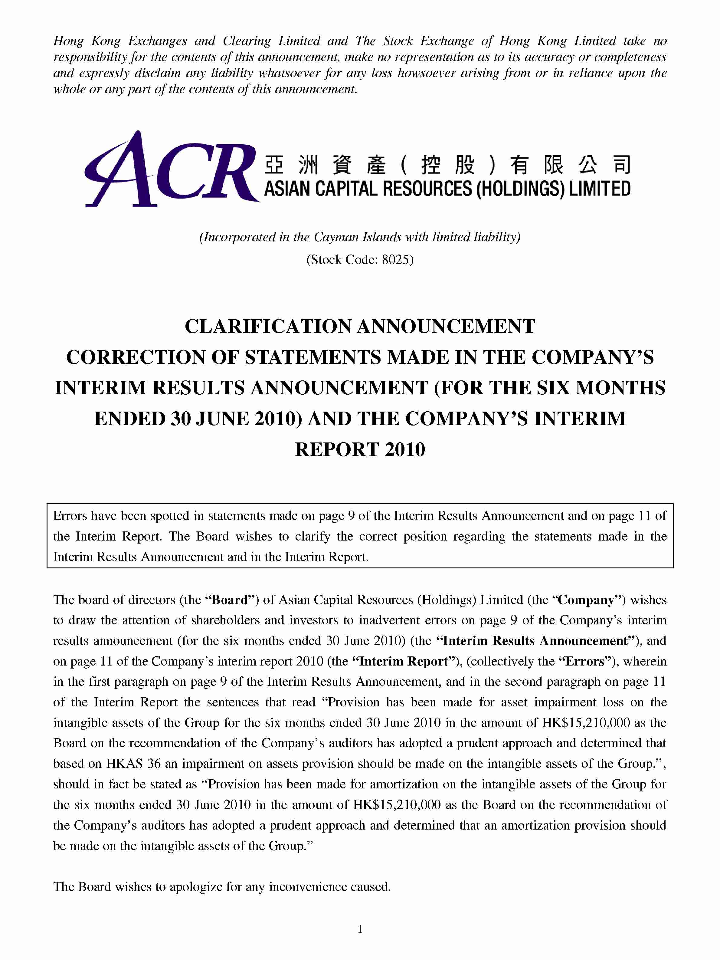 CLARIFICATION ANNOUNCEMENT : CORRECTION OF STATEMENTS MADE IN THE COMPANY'S INTERIM RESULTS ANNOUNCEMENT (FOR THE SIX MONTHS ENDED 30 JUNE 2010) AND THE COMPANY'S INTERIM REPORT 2010