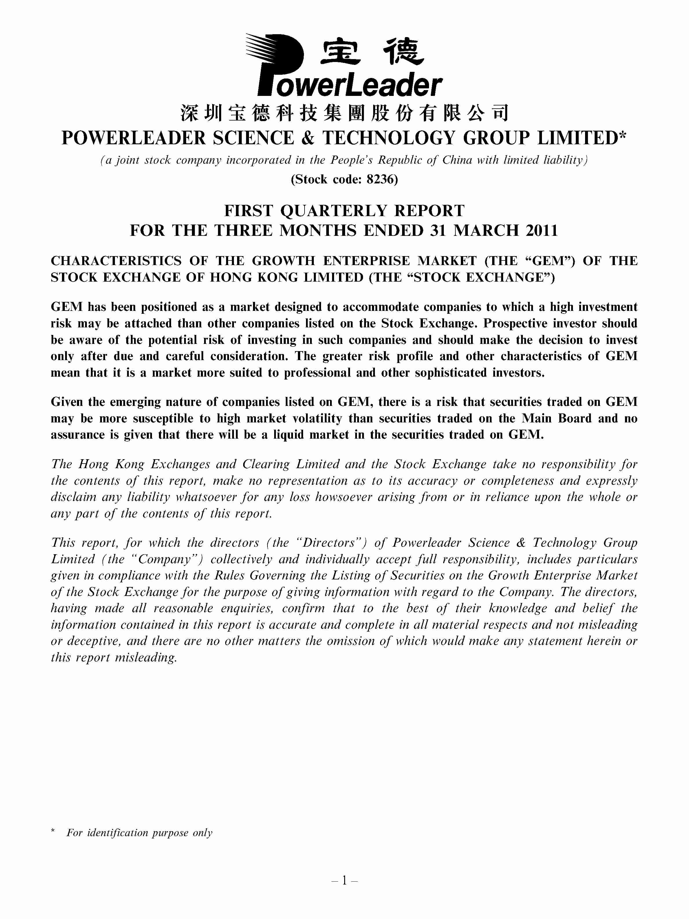 FIRST QUARTERLY REPORT FOR THE THREE MONTHS ENDED 31 MARCH 2011