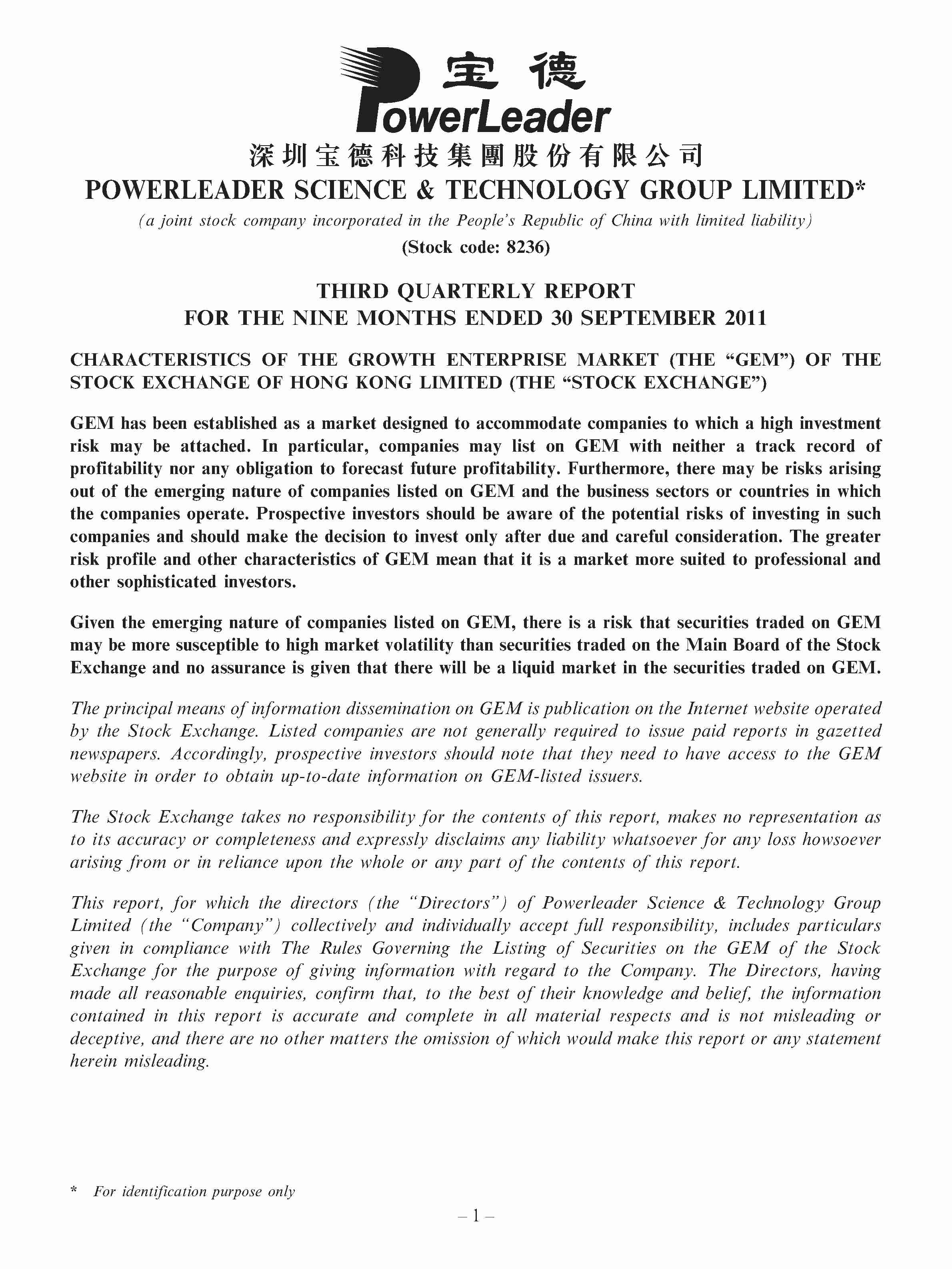 THIRD QUARTERLY REPORT FOR THE NINE MONTHS ENDED 30 SEPTEMBER 2011