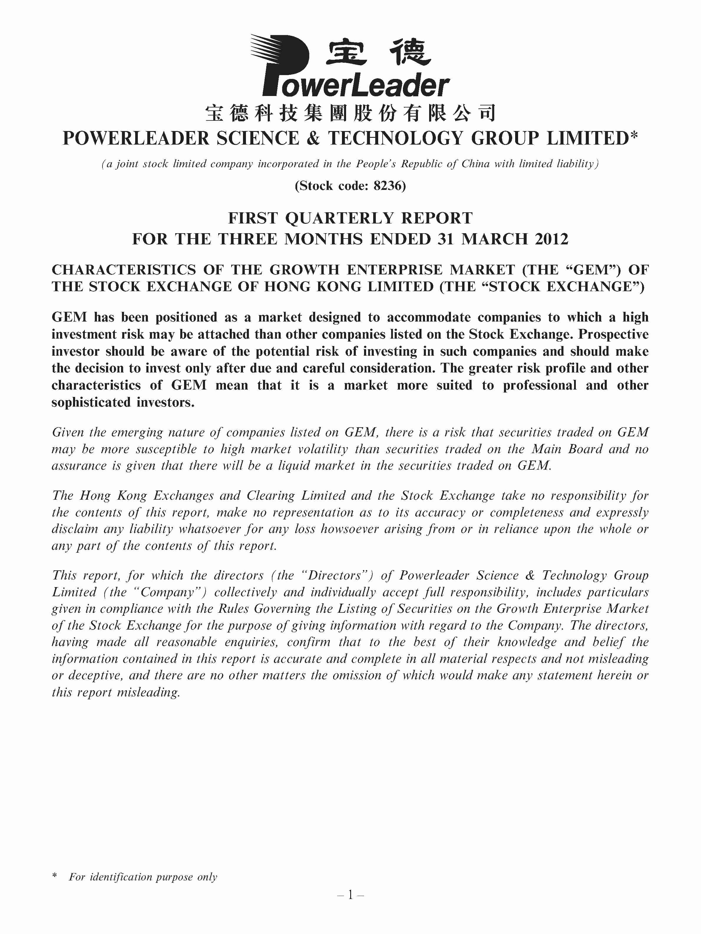 FIRST QUARTERLY REPORT FOR THE THREE MONTHS ENDED 31 MARCH 2012
